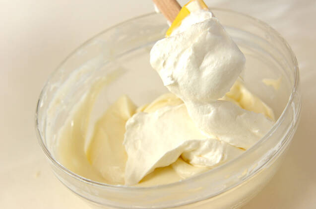 別のボウルで生クリームを8分立てにし、(2)に2~3回に分けて加え、泡立て器からゴムベラに変えて混ぜる。