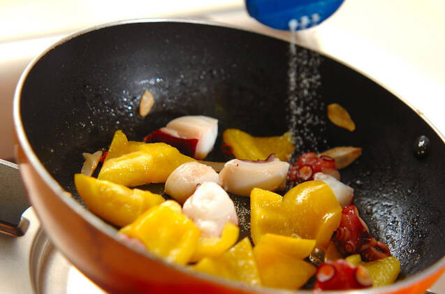 ゆでタコ足と黄パプリカを加えて、中火で1~2分炒める。塩で味を調える。