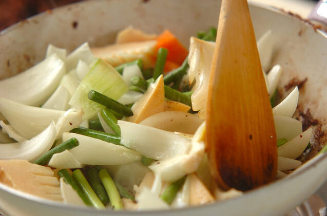 残りのサラダ油を足し、ニンニクの芽、玉ネギ、ニンジン、水煮タケノコを炒める。玉ネギが少ししんなりして、ニンニクの芽の色が鮮やかになるまで炒める。