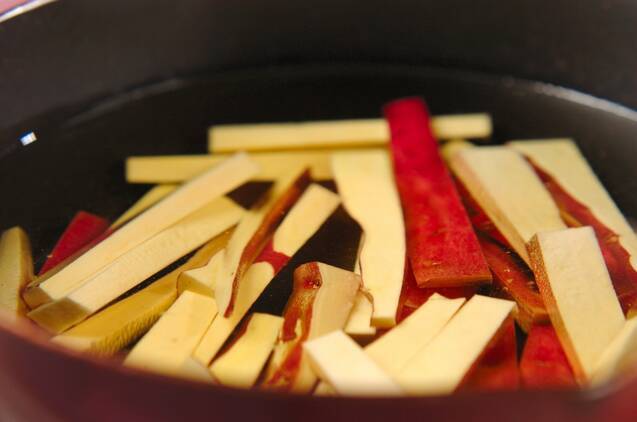 フライパンに常温の揚げ油とサツマイモを入れて中火にかける。薄く色がついて竹串がスッとささる位まで揚げ、油をきる。