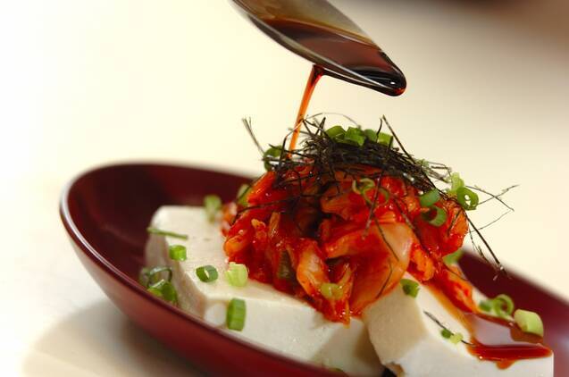 器に絹ごし豆腐を盛り、白菜キムチ、刻みのり、刻みネギをのせ、<タレ>とゴマ油をかける。