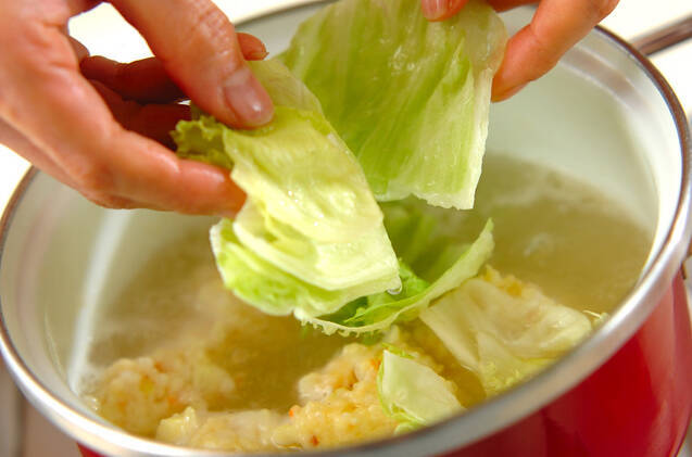 塩コショウで味を調え、食べる直前にレタスをちぎりながら入れ、器に注ぐ。