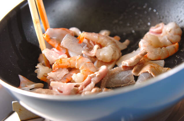 中華鍋にサラダ油を熱し、豚肉、エビ、イカを炒める。