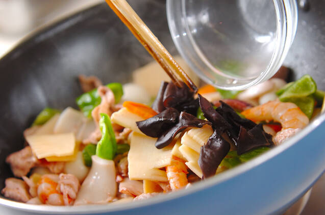 ニンジン、タケノコ、うずら卵、ピーマン、キクラゲを加えて炒め合わせる。