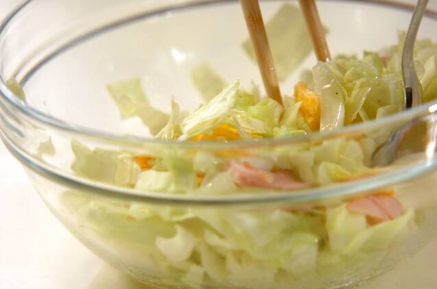 <ドレッシング>のボウルにキャベツ、ハム、(2)を入れて混ぜ合わせ、器に盛る。