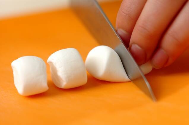 マシュマロは半分に切る。オーブンを120℃に予熱する。