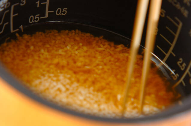 炊飯器に洗い米、ショウガ、<調味料>の材料を加え、通常に炊く水加減の量になるようにだし汁を加え、ひと混ぜする。