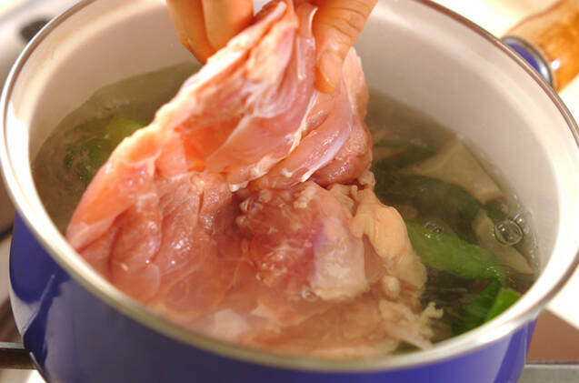 鍋に分量外の水800ml、白ネギの緑の部分、ショウガ、酒を入れて火にかけ、煮たったら鶏もも肉を加え、20分ゆでる。