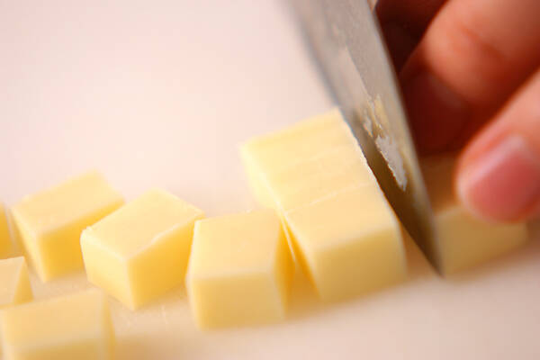 プロセスチーズは1cm角に切って、8等分に分け、ラップをかけて冷蔵庫に入れておく