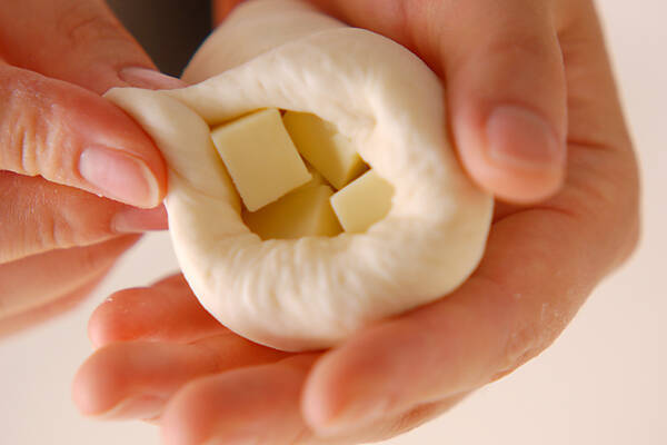 台におき、生地を平たくして真ん中にチーズをのせる。生地の端を引っ張って中央に集め、つまんで閉じる。