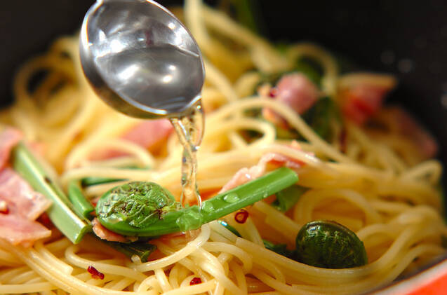 ベーコンに火が通ったらコゴミとスパゲティー、(2)の残しておいたゆで汁を加える。全体にからまったら塩、粗びき黒コショウで味を調え、器に盛る。