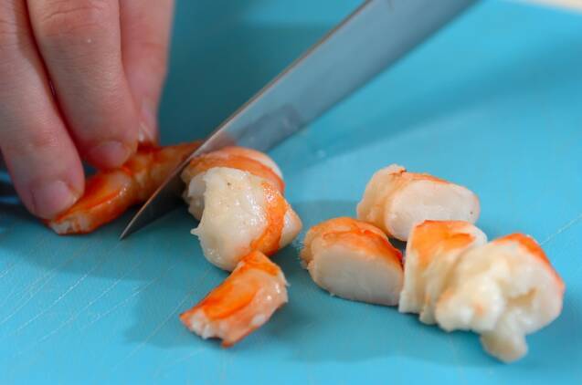 エビは殻付きで白ワインと共に耐熱容器に入れ、電子レンジで1分加熱する。粗熱が取れたら殻をむき、幅1cmに切る。