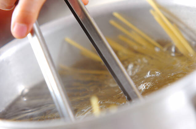 たっぷりの熱湯を沸かして塩を加え、スパゲティを袋記載の指示より1分短かめにゆで、ゆで上がる30秒前にホウレン草を加えて一緒にゆで、ザルに上げる。