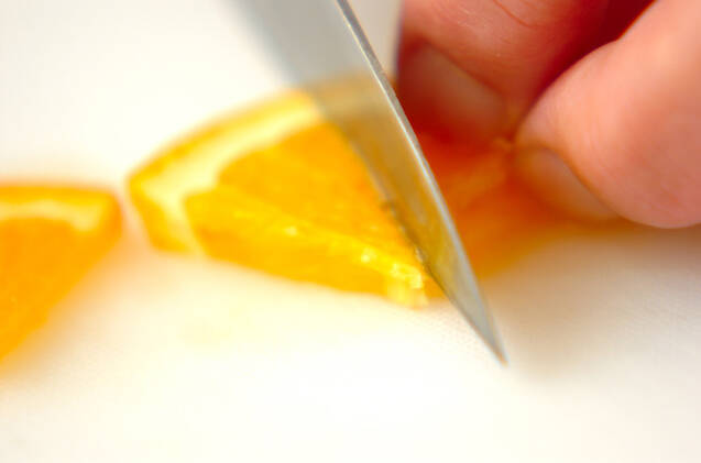 レタスは洗って水気をきり、食べやすい大きさに手でちぎる。セロリは筋を取って縦半分に切り、さらに斜め薄切りにする。ニンジンは皮をむいてスライサーで細切りにし、分量外の塩を少々振ってしばらくおき、水気を絞る。オレンジの薄切りは1枚を8等分にする。
