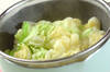 塩を入れた熱湯でキャベツをサッとゆで、ザルに上げてゆで汁をきり、冷ます。粗熱が取れたら、水気を絞る。