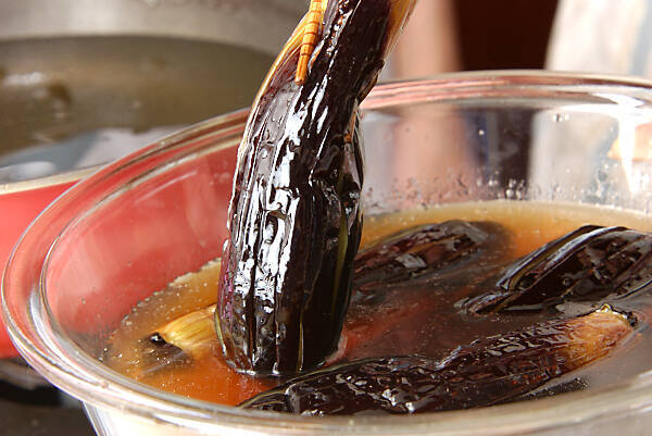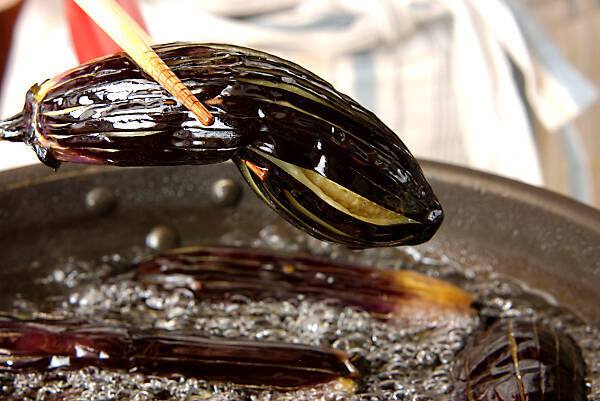 ナスの水気をしっかり拭き取り、170℃の揚げ油に入れ、返しながら揚げ、菜ばしではさみ持ち上げた時に少ししなっていればOK。軽く油きりをして、そのまま<つけダシ>につける。