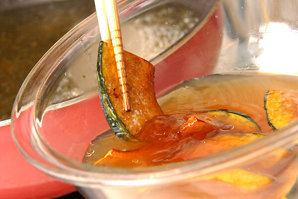続けてカボチャも揚げ油に入れて、揚がれば別に取り分けた<つけダシ>につける。ナスと同じ<つけダシ>につけるとナスの色がついて、色が悪くなります。