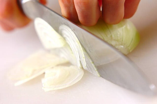 玉ネギは縦半分に切って、縦薄切りにする。