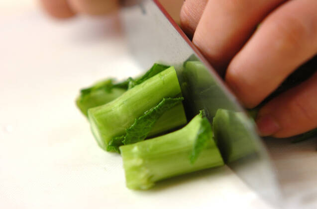菜の花は軸のかたい部分を切り落とす。大きい場合は半分に切り、たっぷりの水につけて10分置き、水気をきる。