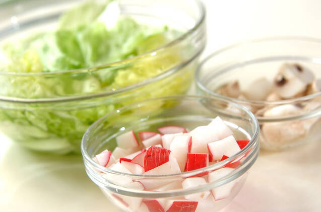 レタスは食べやすい大きさに手でちぎって水に放ち、水気をきる。