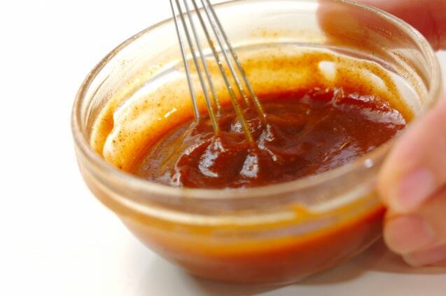 <調味料>の材料を混ぜ合わせる。レタスは水洗いして水気をきり、細切りにする。
