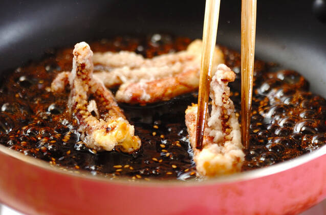 フライパンに<タレ>の材料を入れ、火にかける。砂糖が溶けたら(1)を加え、よくからめて白ゴマを振る。