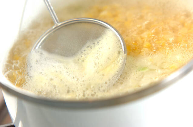 鍋にトウモロコシ、玉ネギ、水、白ワインを入れて火にかける。煮たったらアクを取って弱火にし、蓋をして15分煮る。
