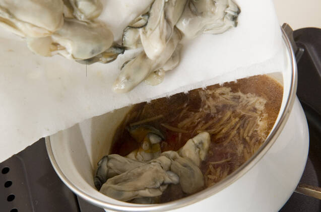 鍋に<煮汁>を入れて中火にかけ、煮立てばショウガを加え、再び煮立てばカキを加える。
