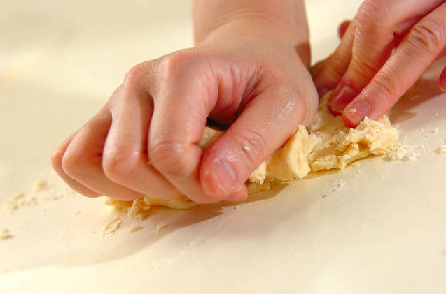 空洞にぬるま湯を注ぎ、ゴムベラで混ぜる。さらに溶き卵を加えて混ぜ、台の上に出す。無塩バターを加えて表面がなめらかになるまでこねる。