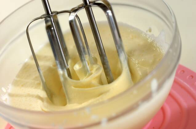 生クリームにグラニュー糖を加えて泡立て、ホイップクリームを作っておく。