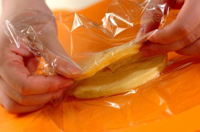 同じ要領ですべての生地を焼き、焼き上がった生地は熱いうちに軽く半分に折り、折りたたんだ形のままラップで包んで冷ましておく。
