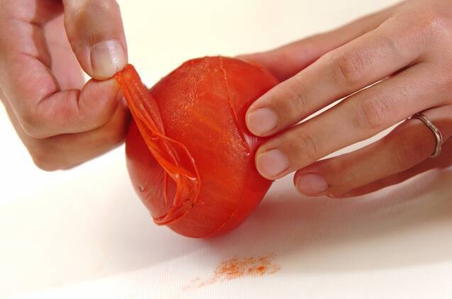 トマトはヘタをくり抜き、ヘタ側をフォークで刺してガス火にかざし、皮が弾けたら皮をむいて食べやすい大きさのくし切りにする。
