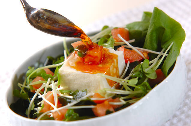 器にサラダ菜とワカメを敷き、豆腐、トマトを盛り付ける。貝われ菜を散らし、食べる直前に<中華ドレッシング>を掛ける。