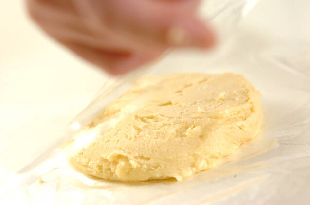 (1)の無塩バターの粒がなくなってきたら、指先で円を描くようにしながら、少しずつ周囲の粉類をくずして中央に混ぜ込んでいく。ひとつにまとまったらラップに包み、冷蔵庫で30分~1時間生地を休ませる。※フードプロセッサーを使用する場合は、全ての材料をワークボウルに入れて混ぜ合わせる。