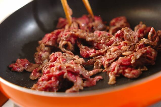 フライパンに半量のサラダ油をひいて中火にかけ、牛ロース肉に小麦粉をまぶして8割火を通して取り出す。フライパンをサッとふいて残りのサラダ油をひき、ニンジン、ヒラタケを炒める。