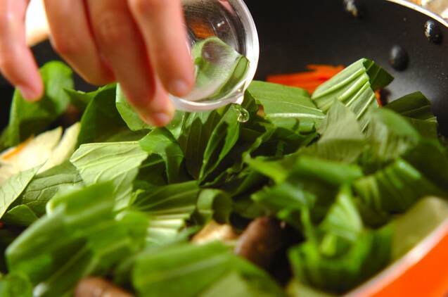 ヒラタケに水分がにじんできたら、チンゲンサイの茎を加えてサッと炒め、次に葉の部分、さらに酒をふって蓋をし、2分ほど蒸し焼きにする。