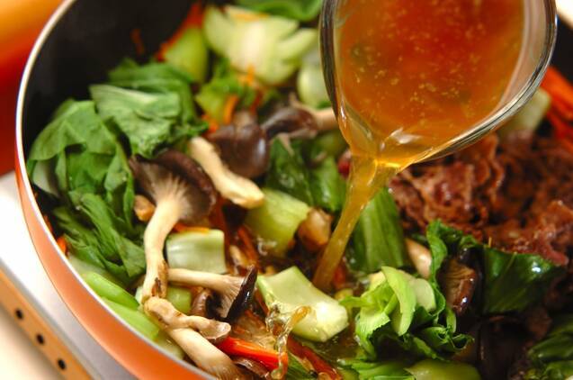 蓋を開け(ここで水分が多ければ一度強火にして水分を飛ばすとよい)、取り出した牛肉、<調味料>を加え、2分ほど煮る。<水溶き片栗>を回し入れ、トロミをつける。