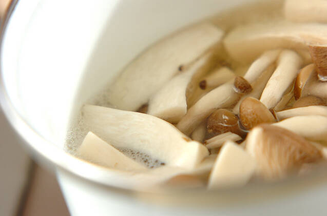 鍋にだし汁、シメジ、エリンギを入れて火にかけ、煮たったら弱火で2~3分煮る。