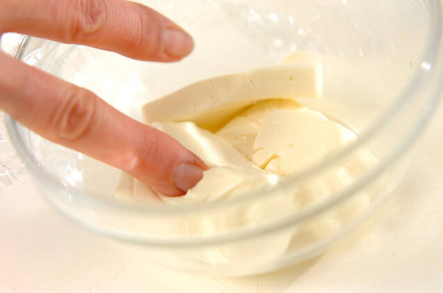 クリームチーズは耐熱容器に入れ、電子レンジで10~20秒加熱して柔らかくする。※電子レンジは600Wを使用しています。
