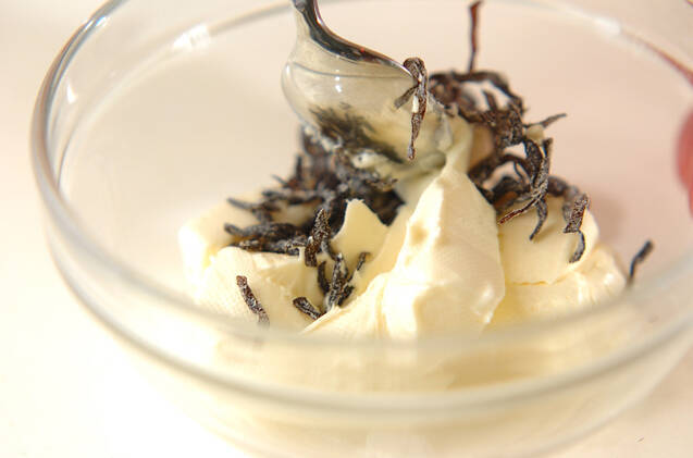 塩昆布が長い場合は食べやすい長さに切り、1のクリームチーズと和える。