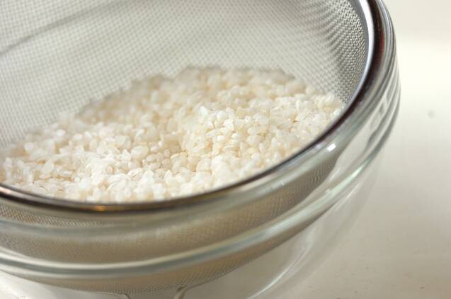 お米は炊く30分前に水洗いしてザルに上げ、水気をきる。