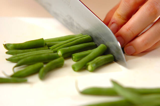 サヤインゲンは軸側を少し切り落とし、長さを3等分に切る。塩を入れた熱湯でお好みのかたさになるまでゆで、ザルに上げる。