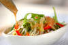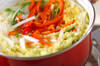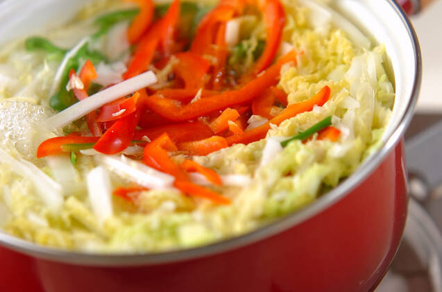 たっぷりの熱湯が煮立ってきたら、分量外の塩を加えてモヤシ、白菜、ピーマン、赤パプリカを入れ、ひと煮立ちしたらザルに上げる。