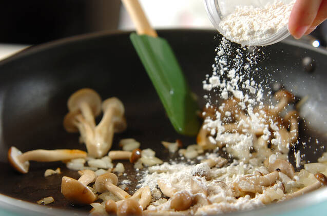 フライパンにバターを入れて火にかけ、玉ネギとシメジを炒める。玉ネギが透き通ってきたら小麦粉を加え、粉っぽさがなくなるまで炒める。