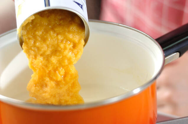 鍋に牛乳、固形チキンスープの素を入れ中火にかけ、固形チキンスープの素が煮溶けたら、クリームコーンを加える。