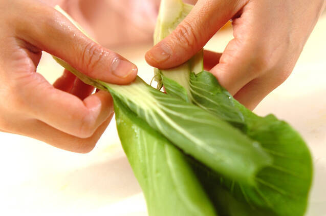 チンゲンサイは縦半分に裂き、熱湯でサッとゆでて水に取り、水気をしっかりきる。