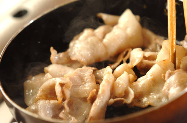 フライパンにサラダ油を熱し、焼き色がつくまで豚バラ肉を中火で焼く。<調味料>の材料とニンニク、ショウガを加え、煮汁が大さじ1程度になるまで煮詰める。