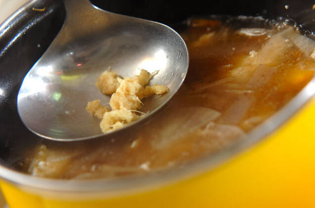 <調味料>の材料、木綿豆腐を加えて2~3分位煮て火を止める。最後にショウガを加え、器に注いで刻みネギを散らす。