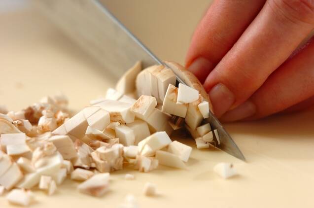 マッシュルームは石づきを切り落とし、かたく絞ったキッチンぺーパーなどで汚れを拭き取り、みじん切りにする。