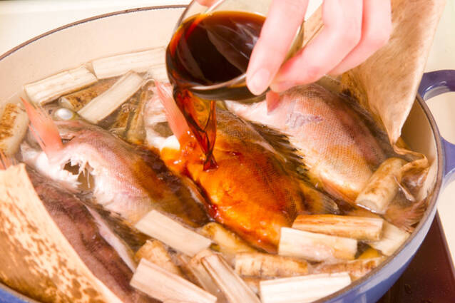 再び煮立てば、中火にして4~5分煮、時々だし汁を全体にかけてメバルの表面を固め、しょうゆを加え、落とし蓋をして、15~20分煮る。